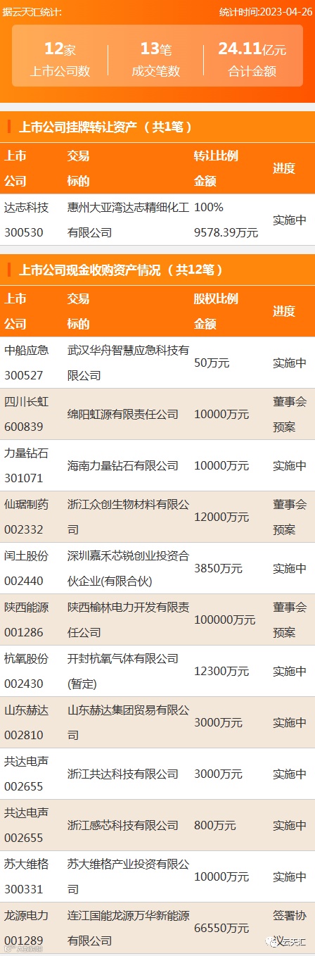2023年4月26日,资产交易成交金额24.11亿元,上市公司12家,成交13笔,上市公司挂牌转让资产1笔,现金收购资产12笔。