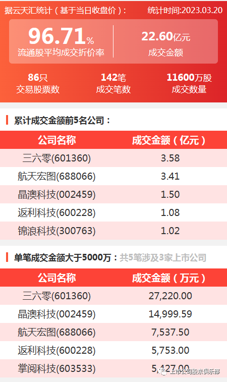 2023年3月20日,大宗交易成交金额22.60亿元,交易股票数86只,成交笔数142笔,流通股平均成交折价率96.71%,成交数量11600万股。