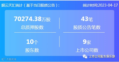 2023年4月17日,股票质押总质押股数70274.38万股,上市公司数9家,股质公告笔数43笔,股东数10个。