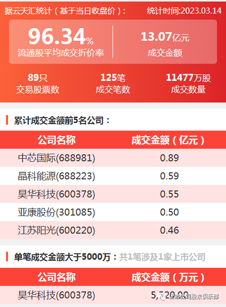2023年3月14日,大宗交易成交金额13.07亿元,交易股票数89只,成交笔数125笔,流通股平均成交折价率96.34%,成交数量11477万股。