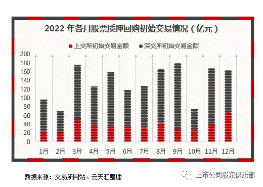 将视角聚焦于2022年各月份情况。受传统节假日休市影响,2月和10月自然是初始交易金额较低的月份,较高的融资月份为3月和9月,初始交易金额均达到175亿元以上;全年每月平均初始交易金额为135.67亿元。回到临近的12月来看,初始交易金额为163.84亿元,与11月基本持平,高于全年平均水平,其中上交所上升至66.25亿元,深交所下跌至97.59亿元。