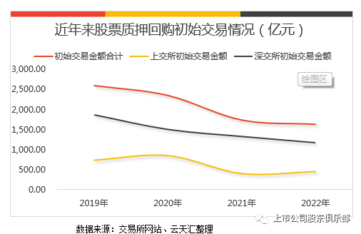 区分沪深两市,上交所股票质押回购的初始交易规模稳重有升,2022年金额为447.54 亿元,相比2021年上升11.95%。而深交所持续下跌,2022年金额为1,180.5亿元,相比2021年下跌11.55%。