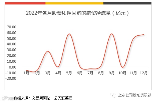 对比股票质押回购的初始交易金额和购回交易金额进行差值分析,我们回顾融资净流量变化情况。在2019 年、2020 年基本全年各月份均是融资净流出,归回融资压倒新增融资。2021 年扭转了方向,融资净流入了 140.5 亿元,而2022年继续延续净流入状态,且净流入金额上升到242.27 亿元,同比增长72.43%,侧面反映了股质前些年积累的存量高难项目基本归还,且增量项目开展谨慎,带来近两年对应的到期购回缩减,所以尽管新增放款持续减少,但净流量上仍在递增。