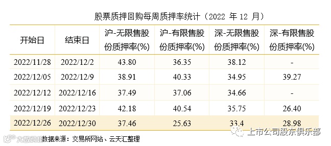 回归到2022年12月情况来看,沪深流通股、限售股质押率环比均有不同程度的提升。年末最后一个统计周的节点数据为:上交所无限售股质押率达到37.46%,限售股为25.63%;深交所无限售股质押率为33.4%,限售股质押率为28.98%。