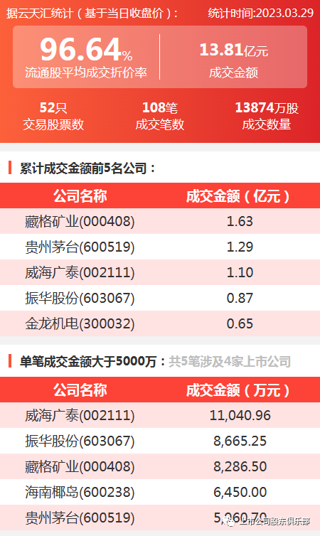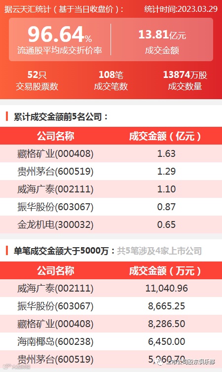 2023年3月29日,大宗交易成交金额13.81亿元,交易股票数52只,成交笔数108笔,流通股平均成交折价率96.64%,成交数量13874万股。