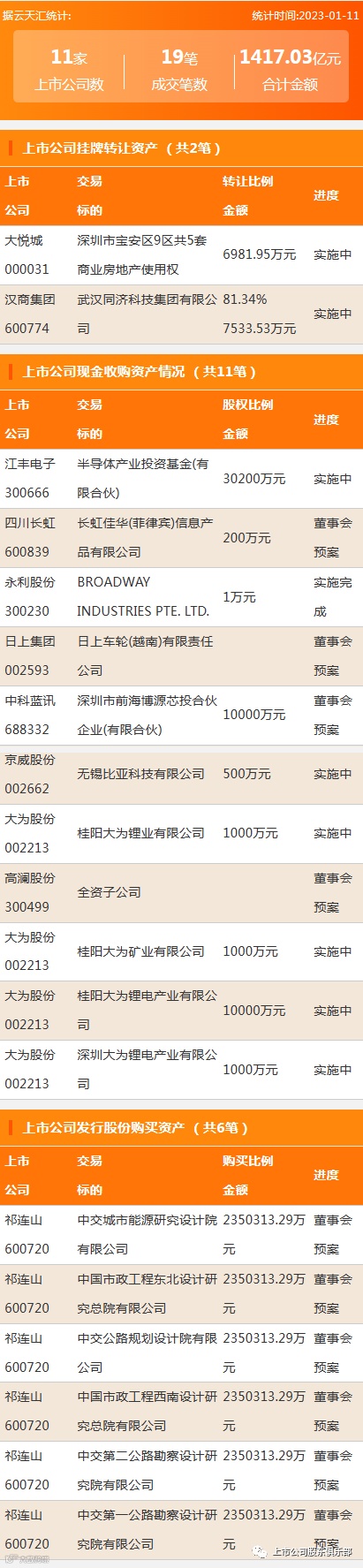 2023年1月11日,资产交易成交金额1417.03亿元,上市公司11家,成交19笔,上市公司挂牌转让资产2笔,现金收购资产11笔,发行股份购买资产6笔。