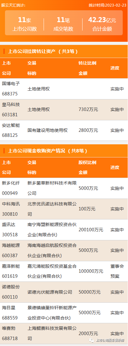 2023年2月23日,资产交易成交金额42.23亿元,上市公司11家,成交11笔,上市公司挂牌转让资产3笔,现金收购资产8笔。