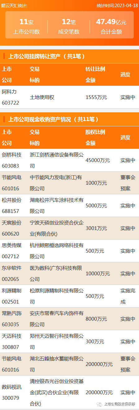 2023年4月18日,资产交易成交金额47.49亿元,上市公司11家,成交12笔,上市公司挂牌转让资产1笔,现金收购资产11笔。