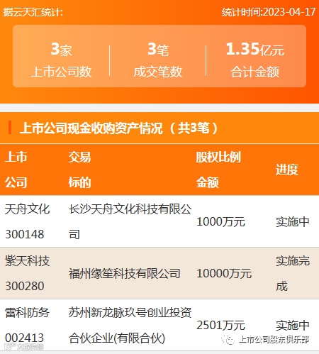 2023年4月17日,资产交易成交金额1.35亿元,上市公司3家,成交3笔,上市公司现金收购资产3笔。