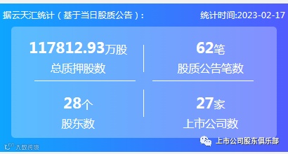 2023年2月17日,股票质押总质押股数117812.93万股,上市公司数27家,股质公告笔数62笔,股东数28个。