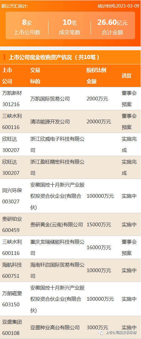 2023年3月9日,资产交易成交金额26.60亿元,上市公司8家,成交10笔,上市公司现金收购资产10笔。