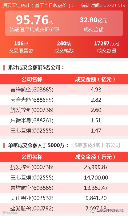 2023年2月13日,大宗交易成交金额32.80亿元,交易股票数106只,成交笔数260笔,流通股平均成交折价率95.76%,成交数量17297万股。