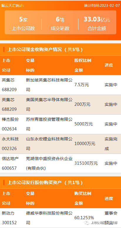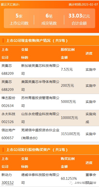 2023年2月7日,资产交易成交金额33.03亿元,上市公司5家,成交6笔,上市公司现金收购资产5笔,发行股份购买资产1笔。