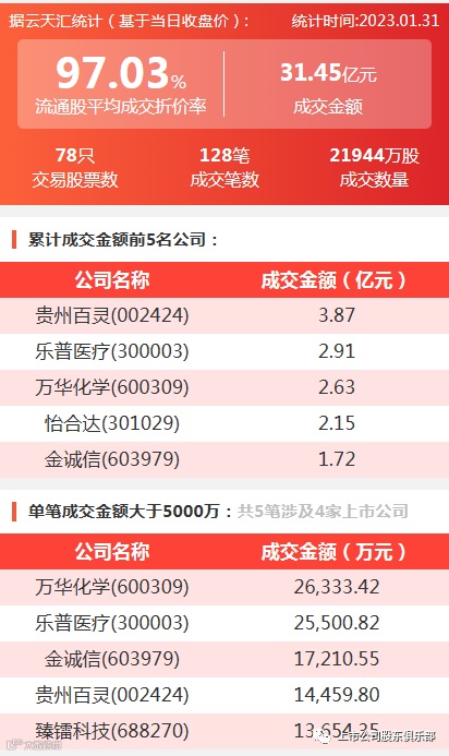 2023年1月31日,大宗交易成交金额31.45亿元,交易股票数78只,成交笔数128笔,流通股平均成交折价率97.03%,成交数量21944万股。