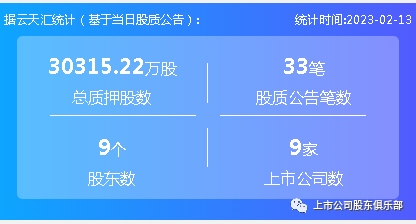 2023年2月13日,股票质押总质押股数30315.22万股,上市公司数9家,股质公告笔数33笔,股东数9个。