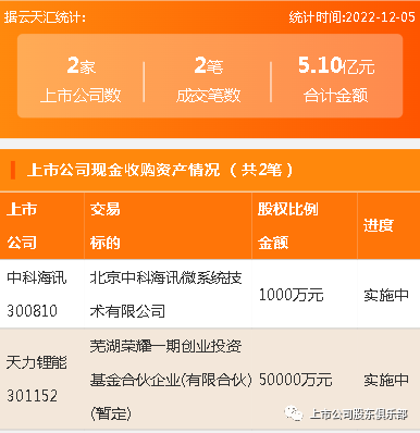 2022年12月05日,资产交易成交金额5.1亿元,上市公司2家,成交2笔,上市公司现金收购资产2笔。