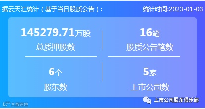 2023年1月3日,股票质押总质押股数145279.71万股,上市公司数5家,股质公告笔数16笔,股东数6个。