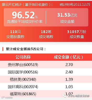 2022年12月05日,大宗交易成交金额31.53亿元,交易股票数110只,成交笔数182笔,流通股平均成交折价率96.52%,成交数量31057万股。