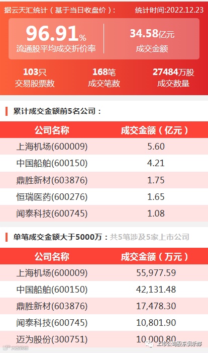 2022年12月23日,大宗交易成交金额34.58亿元,交易股票数103只,成交笔数168笔,流通股平均成交折价率96.91%,成交数量27484万股。