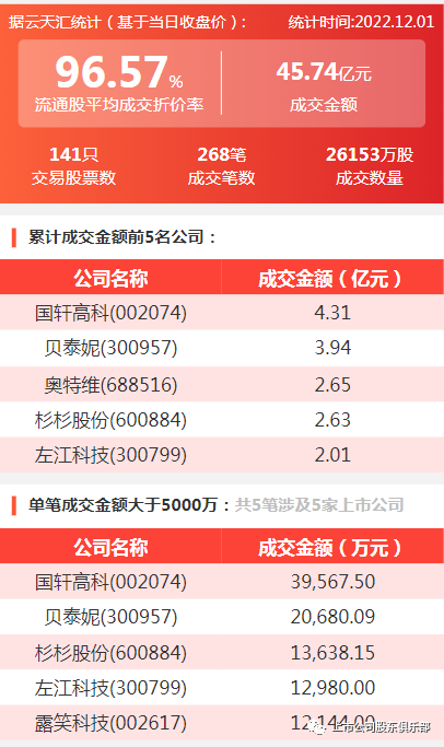 2022年12月01日,大宗交易成交金额45.74亿元,交易股票数141只,成交笔数268笔,流通股平均成交折价率96.57%,成交数量26153万股。