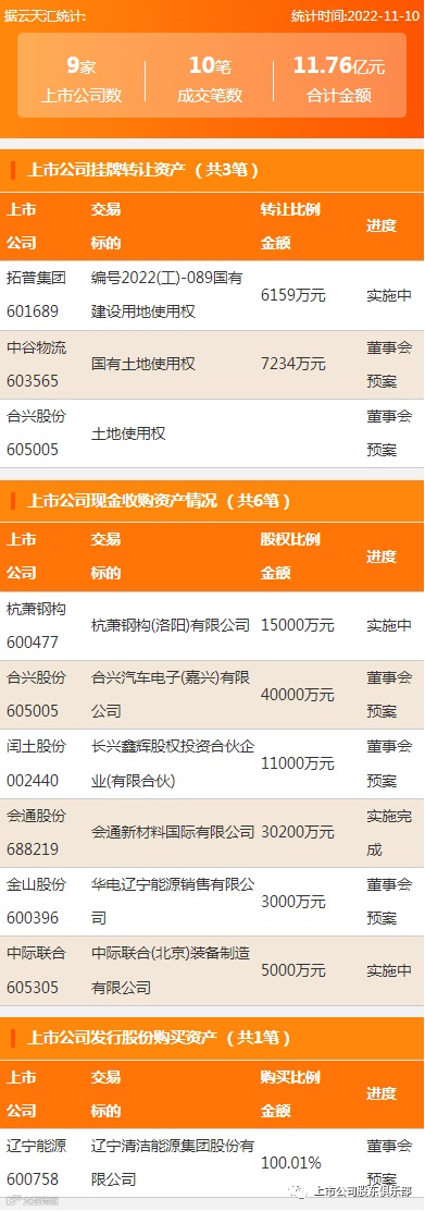 2022年11月10日,资产交易成交金额11.76亿元,上市公司9家,成交10笔,上市公司挂牌转让资产13笔,上市公司挂牌转让资产6笔。
