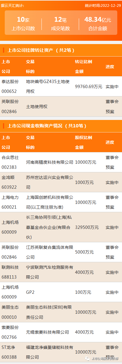 2022年12月29日,资产交易成交金额48.34亿元,上市公司10家,成交12笔,上市公司挂牌转让资产2笔,现金收购资产10笔。