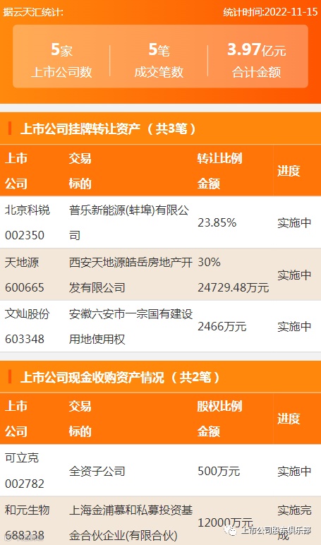 2022年11月14日,资产交易成交金额3.97亿元,上市公司5家,成交5笔,上市公司挂牌转让资产3笔,现金收购资产2笔。
