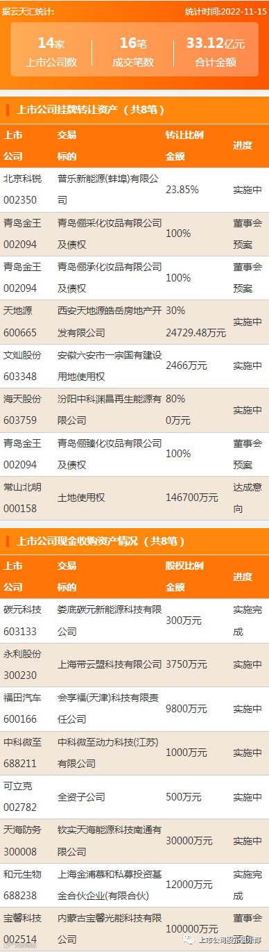 2022年11月15日,资产交易成交金额33.12亿元,上市公司14家,成交16笔,上市公司挂牌转让资产8笔,现金收购资产8笔。