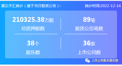 2022年12月14日,股票质押总质押股数210325.38万股,上市公司数36家,股质公告笔数89笔,股东数38个。