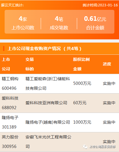 2023年1月16日,资产交易成交金额0.61亿元,上市公司4家,成交4笔,上市公司现金收购资产4笔。