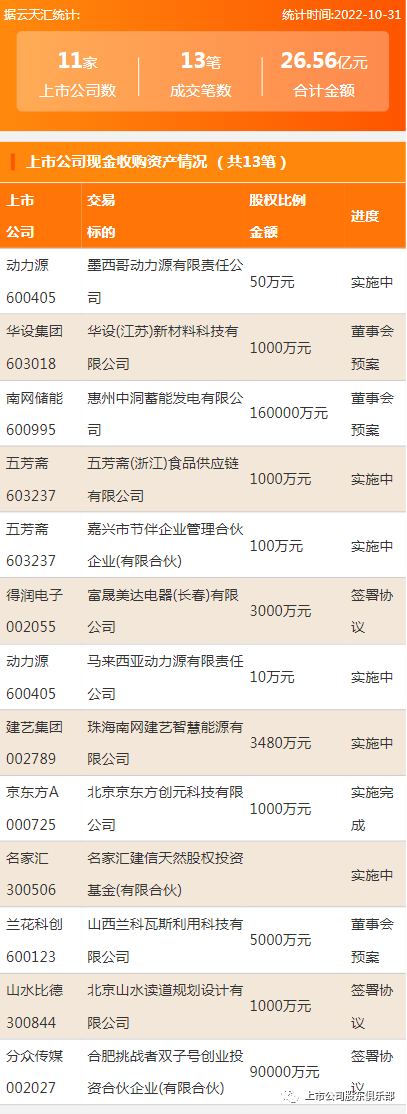 2022年10月31日,资产交易成交金额26.56亿元,上市公司11家,成交13笔,上市公司挂牌转让资产13笔。