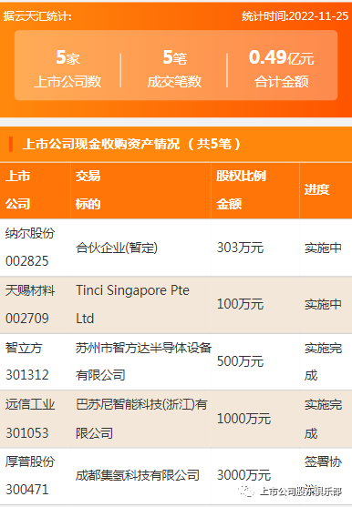 2022年11月25日,资产交易成交金额0.49亿元,上市公司8家,成交5笔,上市公司挂牌转让资产5笔。