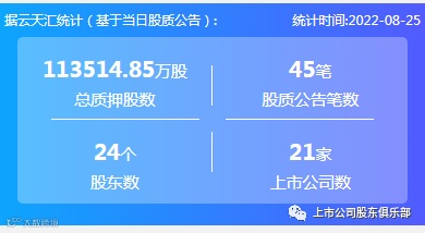 2022年8月25日,股票质押总质押股数113514.85万股,上市公司数21家,股质公告笔数45笔,股东数24个。