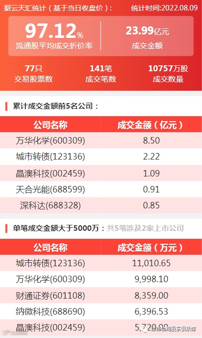 2022年8月9日,大宗交易成交金额23.99亿元,交易股票数77只,成交笔数141笔,流通股平均成交折价率97.12%,成交数量10757万股。