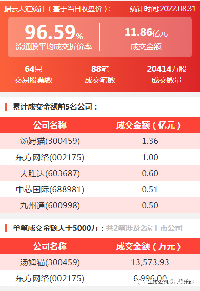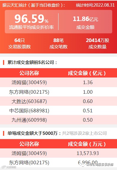 2022年8月31日,大宗交易成交金额11.86亿元,交易股票数64只,成交笔数88笔,流通股平均成交折价率96.68%,成交数量20414万股。