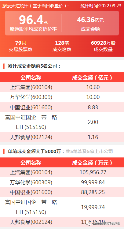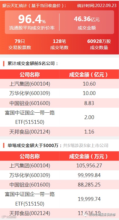 2022年9月23日,大宗交易成交金额46.36亿元,交易股票数79只,成交笔数128笔,流通股平均成交折价率96.4%,成交数量60928万股。
