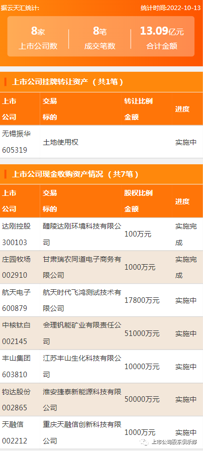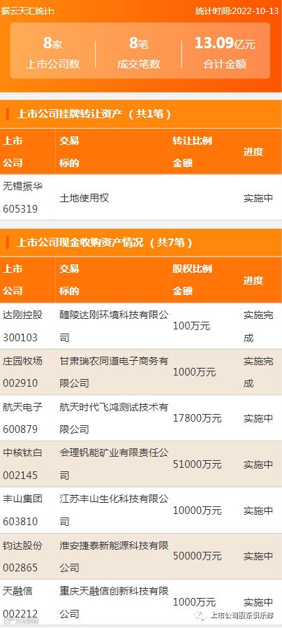 2022年10月12日,资产交易成交金额13.09亿元,上市公司8家,成交8笔,上市公司挂牌转让资产1笔,上市公司现金收购资产7笔。