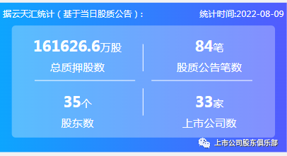 2022年8月9日,股票质押总质押股数161626.6万股,上市公司数33家,股质公告笔数84笔,股东数35个。
