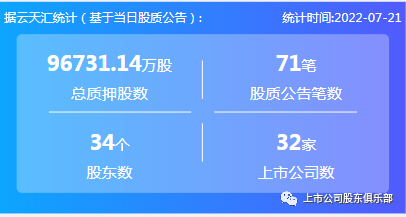 2022年7月21日,股票质押总质押股数96731.14万股,上市公司数32家,股质公告笔数71笔,股东数34个。