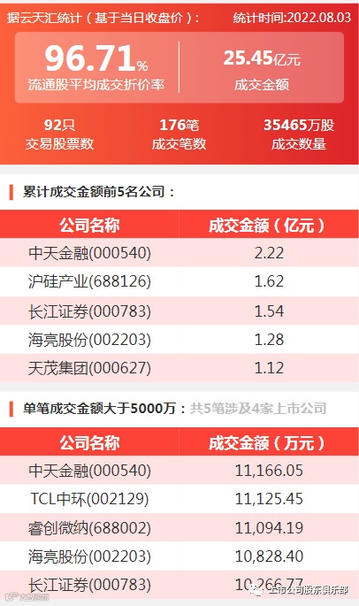 2022年8月3日,大宗交易成交金额25.45亿元,交易股票数92只,成交笔数176笔,流通股平均成交折价率96.71%,成交数量35465万股。