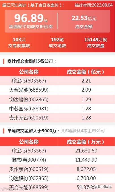 2022年8月4日,大宗交易成交金额22.53亿元,交易股票数103只,成交笔数192笔,流通股平均成交折价率96.89%,成交数量15149万股。