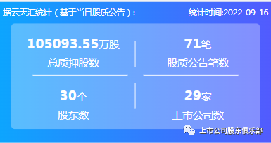 2022年9月16日,股票质押总质押股数105093.55万股,上市公司数29家,股质公告笔数71笔,股东数30个。