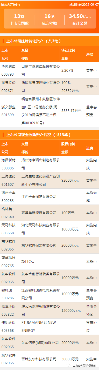 2022年9月7日,资产交易成交金额34.50亿元,上市公司13家,成交16笔,上市公司挂牌转让资产3笔,上市公司现金收购资产13笔。