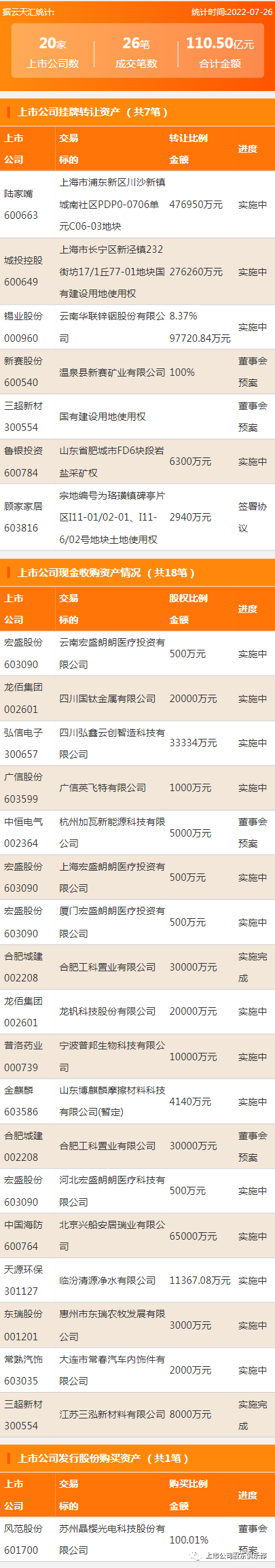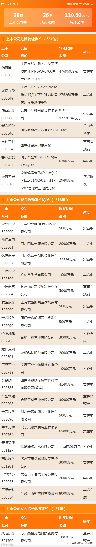 2022年7月26日,资产交易成交金额110.5亿元,上市公司20家,成交26笔,上市公司挂牌转让资产7笔,上市公司现金收购资产18笔,上市公司发行股份购买资产1笔。