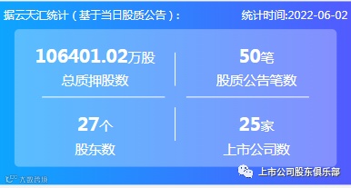 2022年6月2日,股票质押总质押股数106401.02万股,上市公司数25家,股质公告笔数50笔,股东数27个。