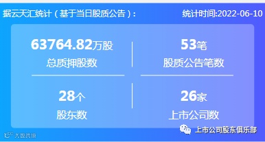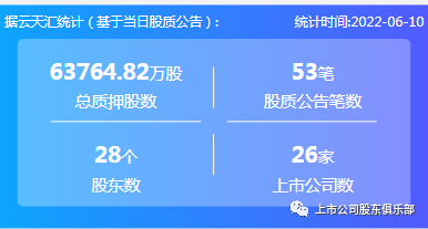 2022年6月10日,股票质押总质押股数63764.82万股,上市公司数26家,股质公告笔数53笔,股东数28个。