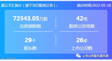 2022年5月18日,股票质押总质押股数72543.05万股,上市公司数26家,股质公告笔数42笔,股东数29个。