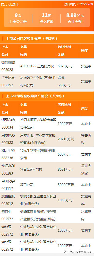 2022年6月9日,资产交易合计金额8.99亿元,上市公司9家,成交11笔,上市公司挂牌转让资产2笔,上市公司现金收购资产9笔。