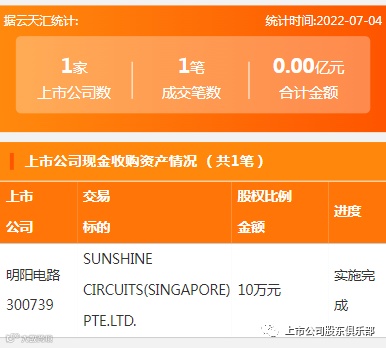 2022年7月4日,资产交易上市公司1家,成交1笔,上市公司现金收购资产1笔。