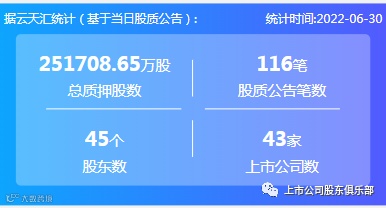 2022年6月30日,股票质押总质押股数251708.65万股,上市公司数43家,股质公告笔数116笔,股东数45个。